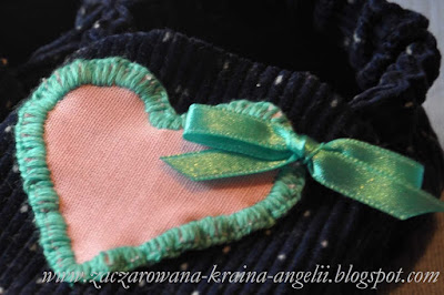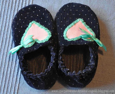 Uszyłam więc takie oto ciapulki dla Julki, z bardzo miękkiego sztruksu w kropki, ozdobiłam serduchami i voila! Takie skarpeto-kapcie gotowe!