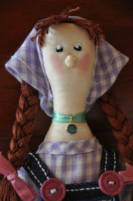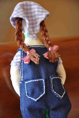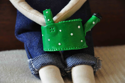 Już oficjalnie chyba mogę oświadczyć, że szycie lalek mnie wciągnęło na amen! Pracochłonne to zajęcie, nie powiem, ale za to jakże przyjemne uczucie, kiedy kolejna wyskakuje spod igły 🙂 Tym razem uszyłam ogrodniczkę w ogrodniczkach rzecz jasna bo jakże inaczej. Ogrodniczki z dżinsu, warkocze obowiązkowe, chusteczka na głowie i dalej do pracy w ogrodzie, choćby boso 🙂 Zaopatrzyłam ją w soczyście zieloną konewkę, którą ulepiłam z modeliny. Tak jakoś ten atrybut ogrodniczki wydał mi się najbardziej właściwy do pracy w ogrodzie.
