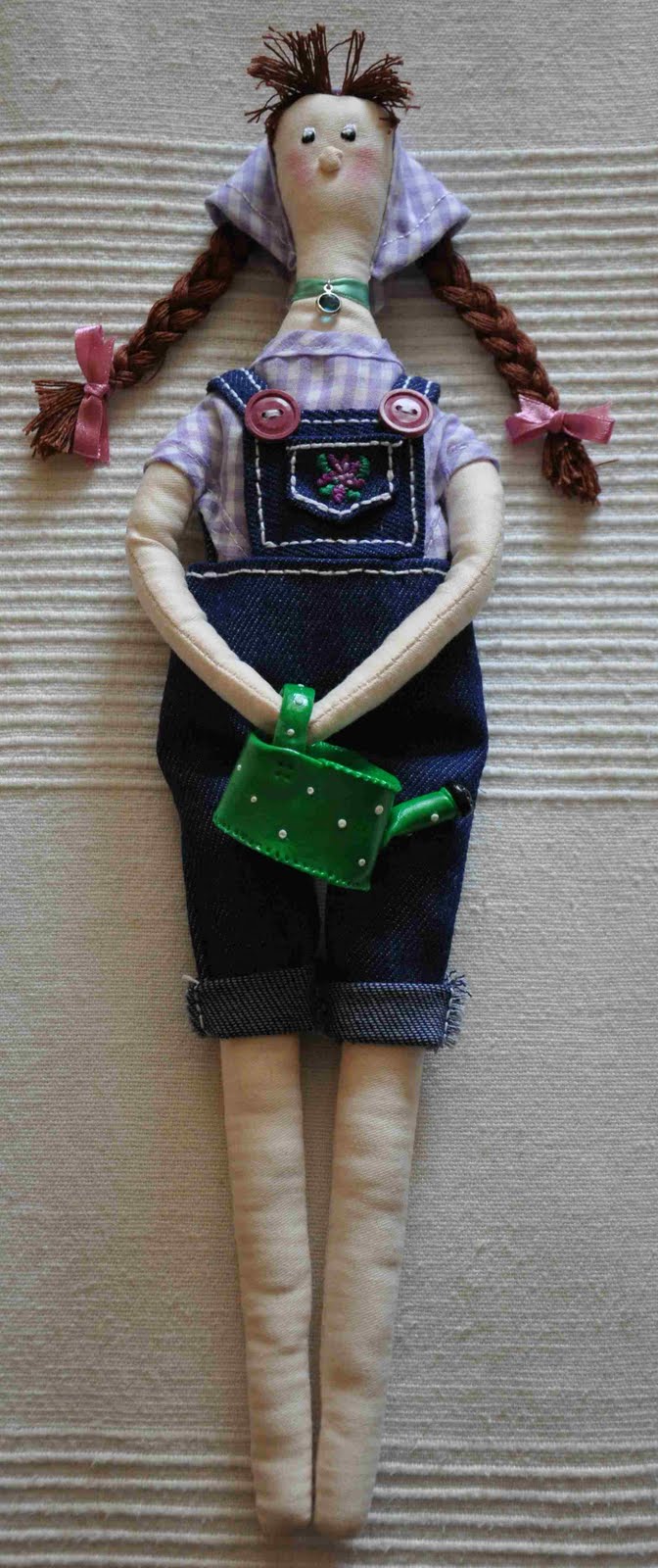 Już oficjalnie chyba mogę oświadczyć, że szycie lalek mnie wciągnęło na amen! Pracochłonne to zajęcie, nie powiem, ale za to jakże przyjemne uczucie, kiedy kolejna wyskakuje spod igły 🙂 Tym razem uszyłam ogrodniczkę w ogrodniczkach rzecz jasna bo jakże inaczej. Ogrodniczki z dżinsu, warkocze obowiązkowe, chusteczka na głowie i dalej do pracy w ogrodzie, choćby boso 🙂 Zaopatrzyłam ją w soczyście zieloną konewkę, którą ulepiłam z modeliny. Tak jakoś ten atrybut ogrodniczki wydał mi się najbardziej właściwy do pracy w ogrodzie.