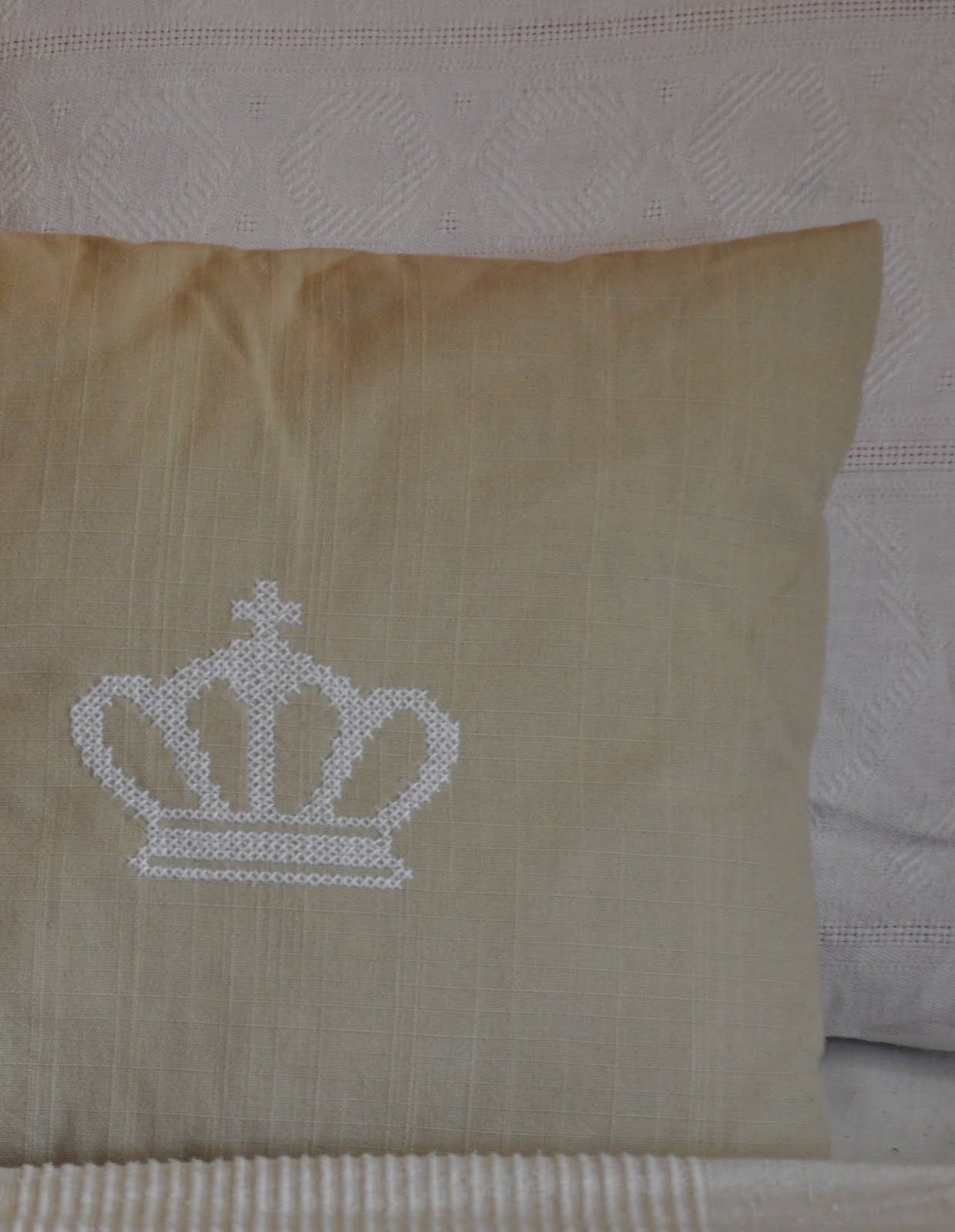 Jakiś czas temu naszło mnie na nowe poszewki w sypialni. Dorwałam nożyczki i zgrabnie omijając plamę zapomniany obrus zamieniłam w dwie poszewki, które ozdobiłam wyhaftowanymi koronami. Wzór znalazłam na stronie niezwykle utalentowanej Penelopis.