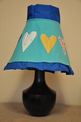 Wymóg był prosty.. miało to być coś co łatwo na lampę założyć, ale i co łatwo z niej zdjąć, koniecznie musiało mieć coś co przytłumi światło wydostające się spod abażuru i sponad niego.. Stąd coś na kształt falbanki na dole i coś na kształt ..hmm komina (?) na górze.. Guziczek zapewnia sprawne założenie całej konstrukcji i szybkie jej zdjęcie w razie potrzeby.. Sprawdza się co najważniejsze.. Światło lampy jest teraz subtelniejsze, a kolorowe akcenty dodają całkiem fajnego klimatu. Wykonanie w 100% ręczne, stąd tyle nieplanowanych krzywizn ;P ale ogólnie rzecz biorąc jestem zadowolona z efektu.