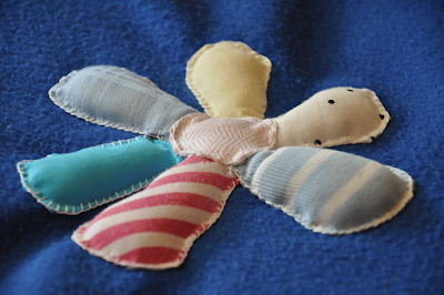 Moja córa dostała ostatnio od babci polarkowy kocyk w myśl zasady: „Zima jest i jest zimno, więc kolejny kocyk dla dziecka przyda się, a jakże”… Kocyk mimo, że mięciutki i bardzo przyjemny w dotyku, wydał mi się nieco smutny.. Ot taki ciemno-smętno-niebieski… Postanowiłam go troszkę rozjaśnić.. naszyłam więc na nim kilka takich kwiatków, każdy płatek wypychając cierpliwie poduszkowym wkładem, aby może odrobinę ciekawszy efekt uzyskać.. Prawda, zajęło mi to kilka wieczorów … pewnie byłoby szybciej, ale po pierwsze primo wciąż nie posiadam tej jakże upragnionej maszyny do szycia, a po drugie secundo, potwornie trudno naszywać kolejne płatki, kiedy raz po raz, niespełna roczny glut ucieka z jednym z nich w garści i za nic oddać nie chce…