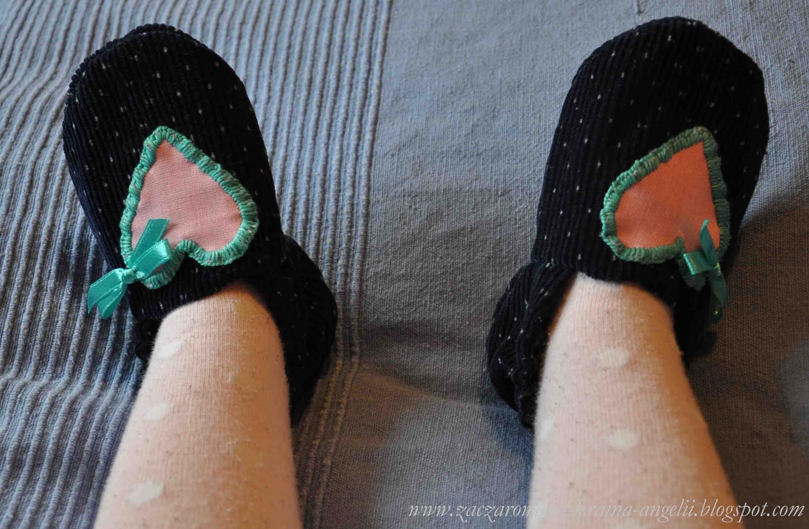 Uszyłam więc takie oto ciapulki dla Julki, z bardzo miękkiego sztruksu w kropki, ozdobiłam serduchami i voila! Takie skarpeto-kapcie gotowe!